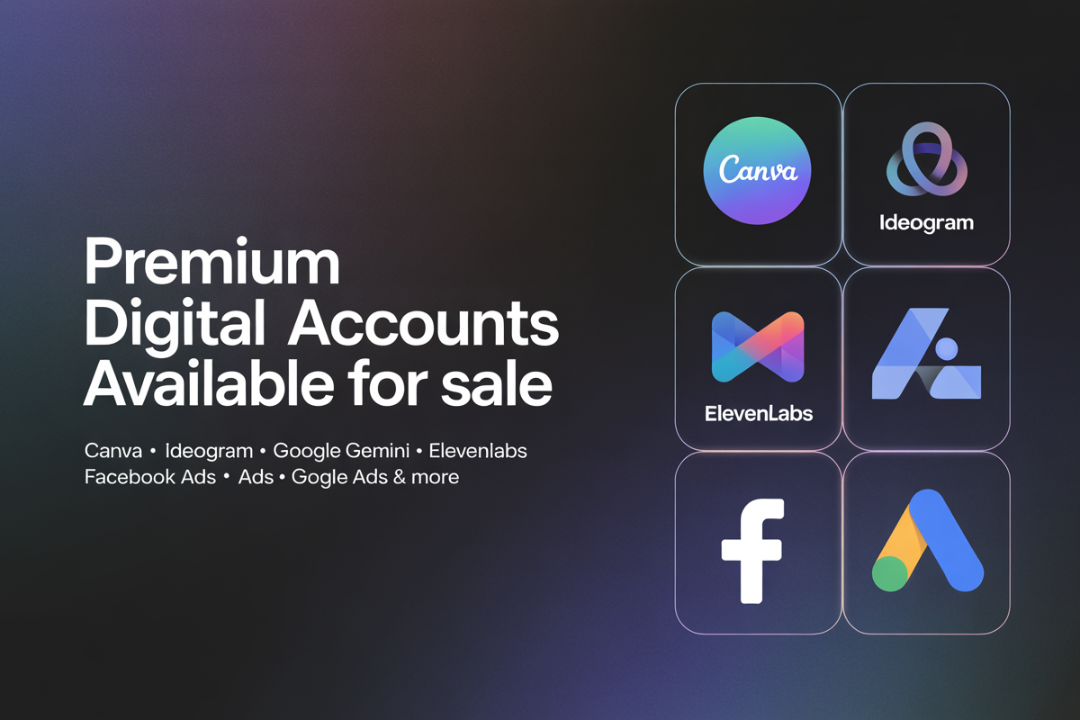 Premium digital accounts available for sale, including Canva, Ideogram, Google Gemini, ElevenLabs, Facebook Ads Threshold, and Google Ads Threshold accounts—fully verified, secure, and ready for instant use worldwide.